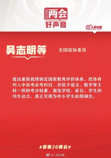 比较有代表性的有5月23日来自人民日报的消息,全国政协委员吴志明领衔提交为中小学生减负的提案,建议重新梳理制定国家教育评价体系,把体育列入中高考必考科目,并给予语文、数学等主科一样的考分权重,激发学校、家长、学生的内生动力,真正实现为中小学生松绑减负。吴志明等委员提出,加强社会宣传和对家长的引导,将孩子的身心健康排第一位,尊重教育的规律和孩子成长的自由。