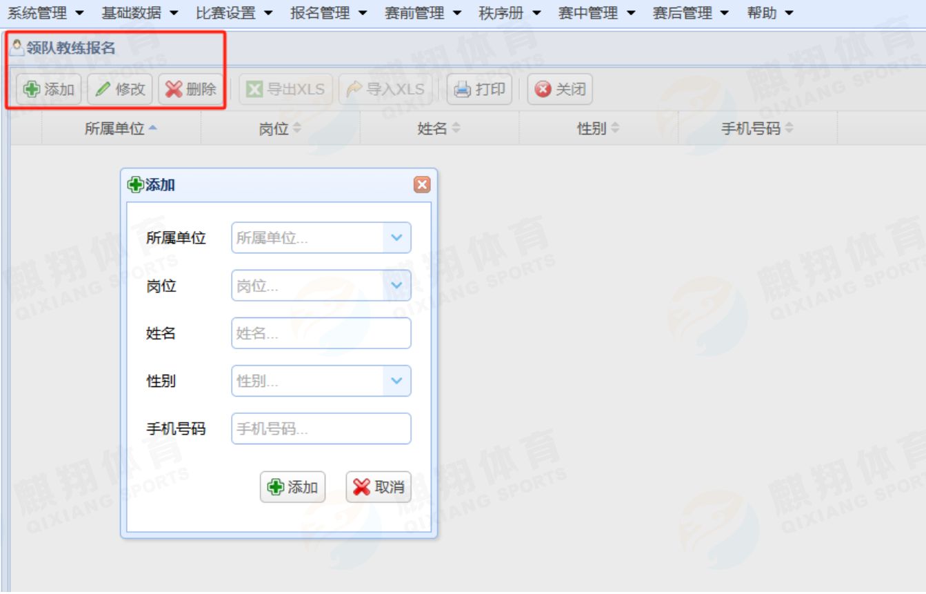 点击【报名管理】-【领队教练报名】-【添加】-填入信息即可。