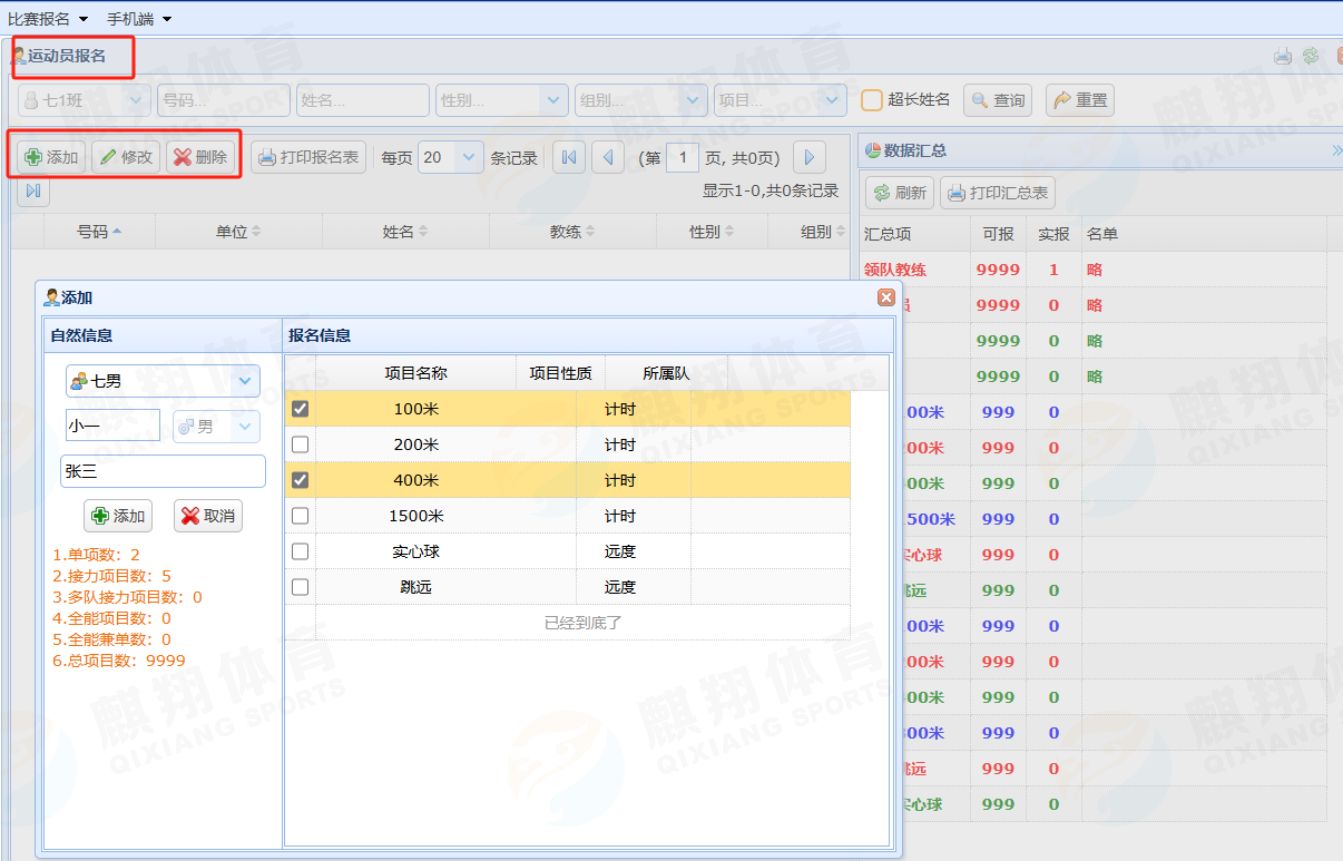 点击【报名管理】-【运动员报名】-【添加】-填写信息,勾选参加的项目即可报名完成。