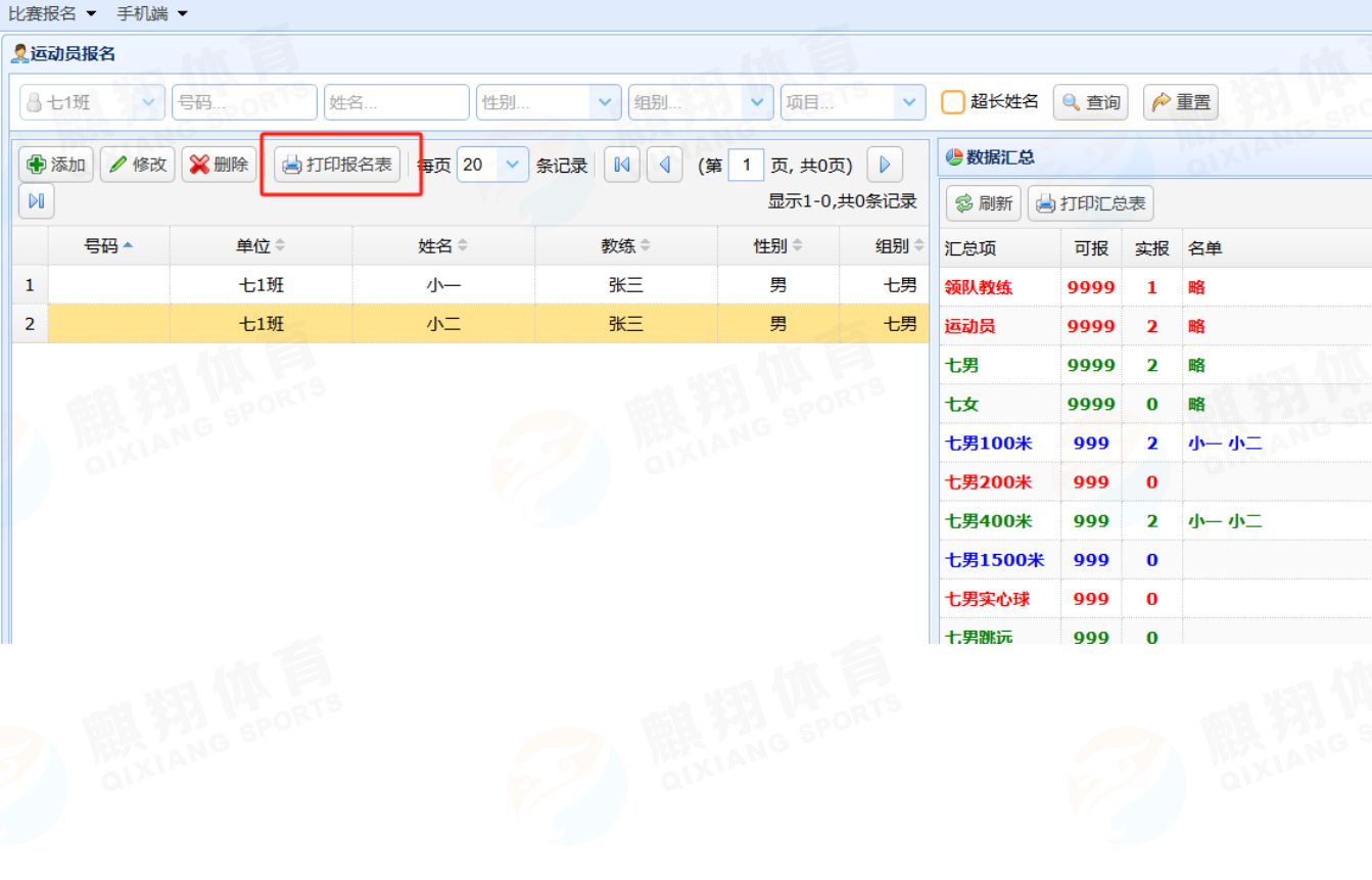 报名完成后,点击【打印汇总表】:查看报名情况,检查否有运动员未参加or报错项目的情况。