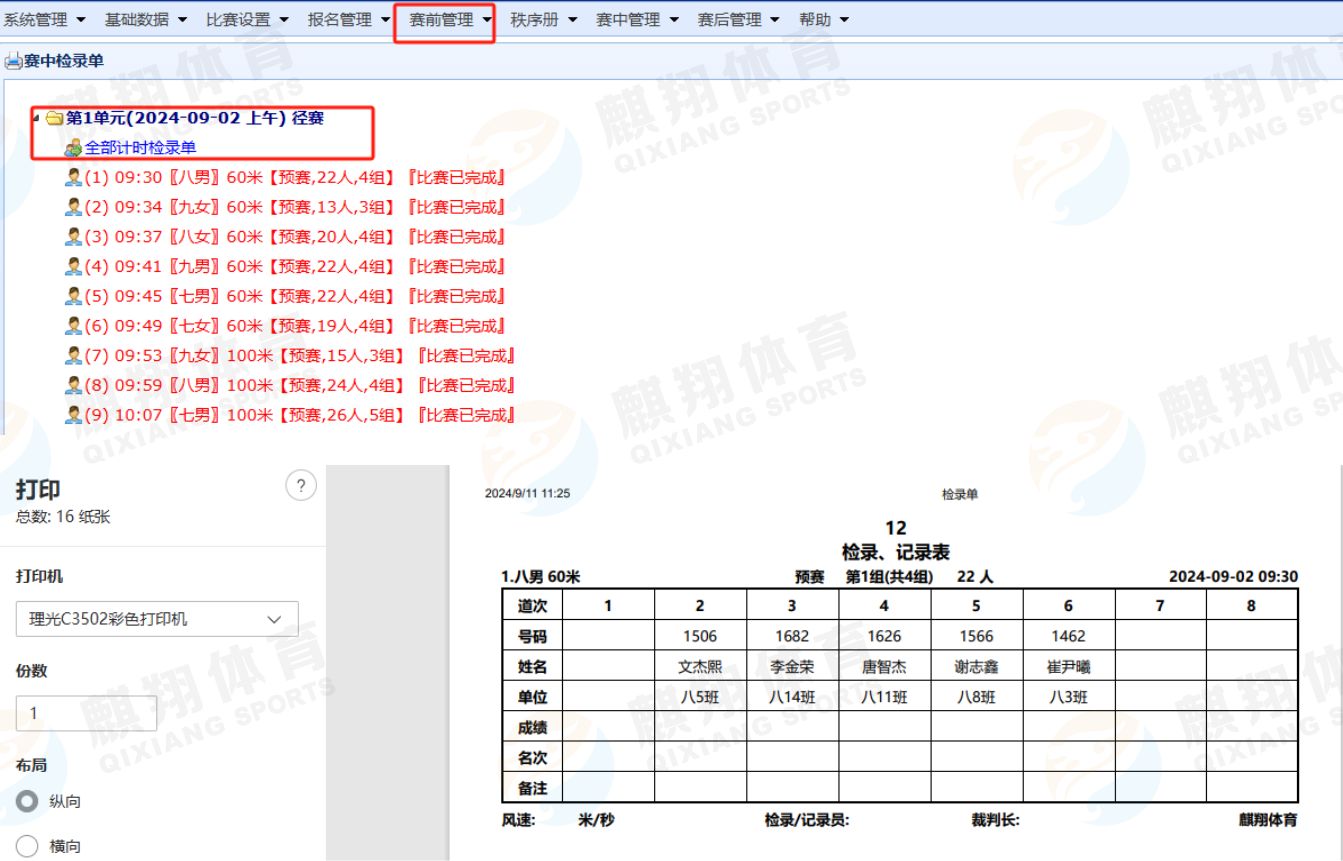 点击【赛中管理】-【检录单】:检查田赛、竞赛检录单,确认无误后打印,给到主办方。