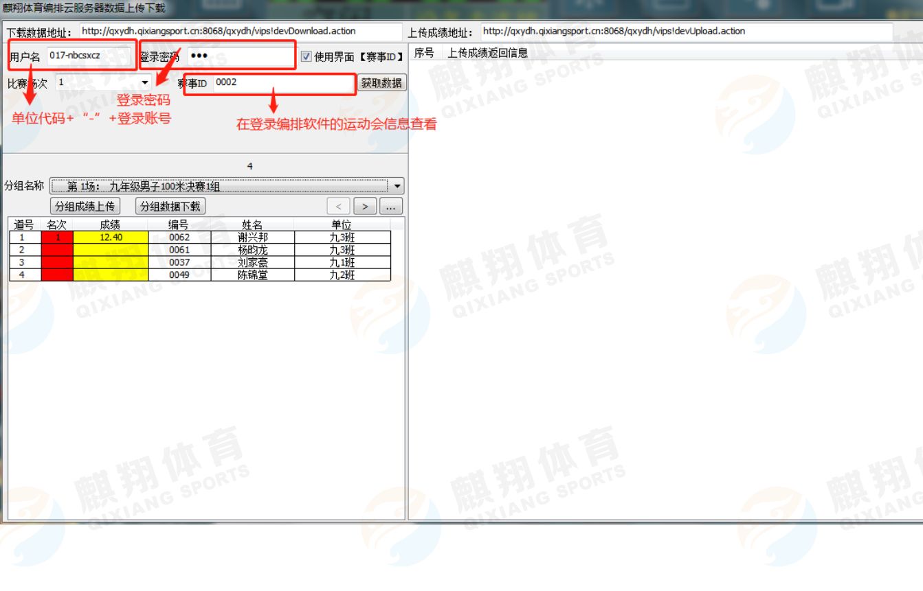 在【麒翔云服务器】弹出框中输入下载数据地址,上传成绩地址,输入登录密码,比赛场次、赛事ID(可在编排系统的运动会信息查看)。