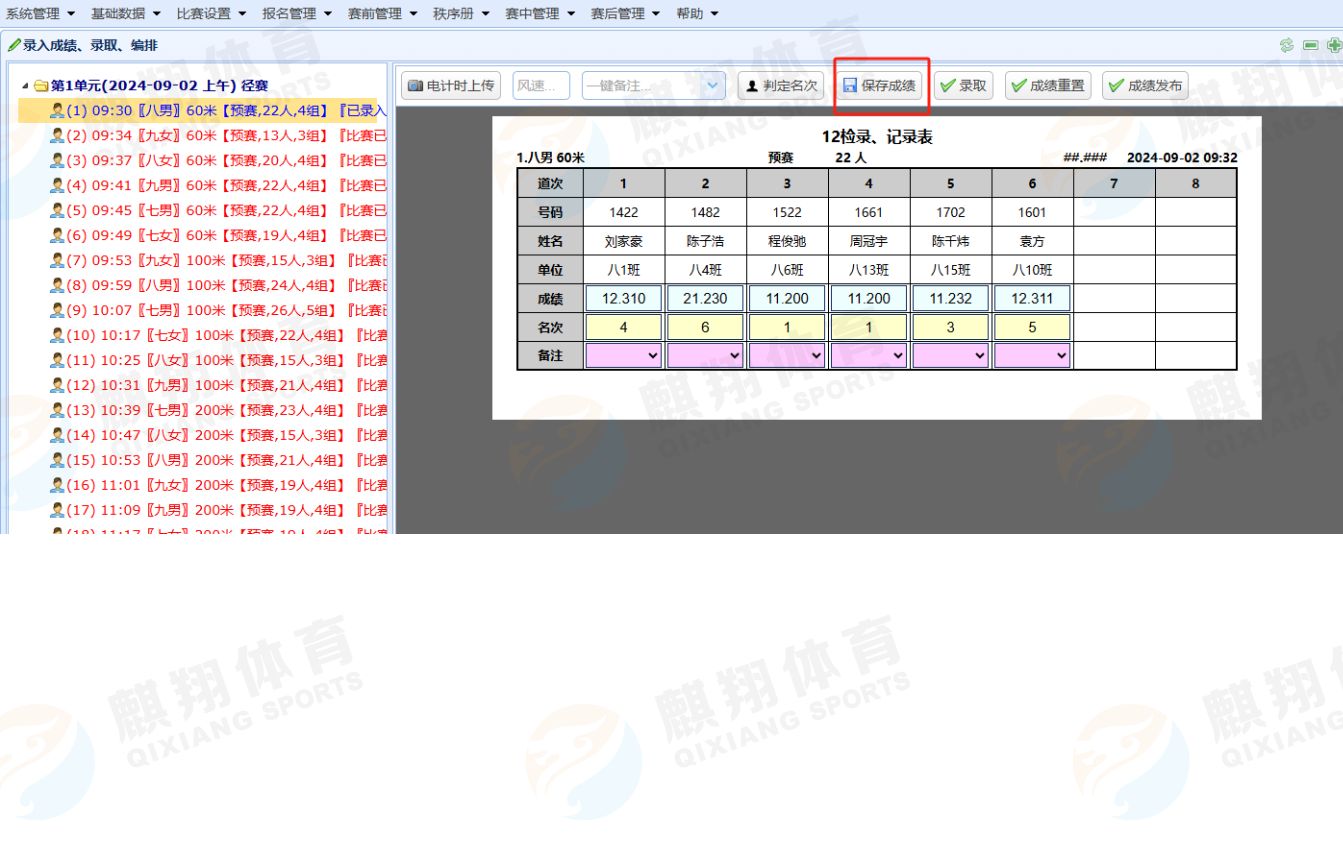 通过电计软件获取每个运动员比赛成绩,发送至编排系统。收到成绩后,点击【保存成绩】。