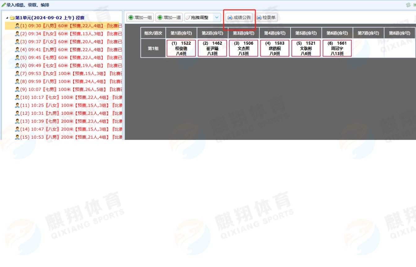 【录取】-【录取下一赛次】-【成绩公示】:成绩打印出来给主办方进行公示,确认无误可进行决赛编排。